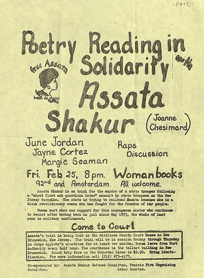 AFTERWORD: Assata Olugbala Shakur. 1947 in Flushing, Queens. 2025 in Havana, Cuba. Some headlines — “fugitive Black militant” — “convicted revolutionary” — “activist turned refugee” — “the FBI’s most wanted domestic terr0r1st” — “cold-blooded c0p k1ll3r” — “Black Panther Party & Black Liberation Army member” — “Black icon who escaped US captivity” — “she who struggles” — “they who are grateful” — “God-mother” — “Poet” — on and on and on. i hope to earn half these titles, i hope to be remembered as half the woman Assata was, i hope to die right, i hope to die free, and most of all… i hope you enjoy!